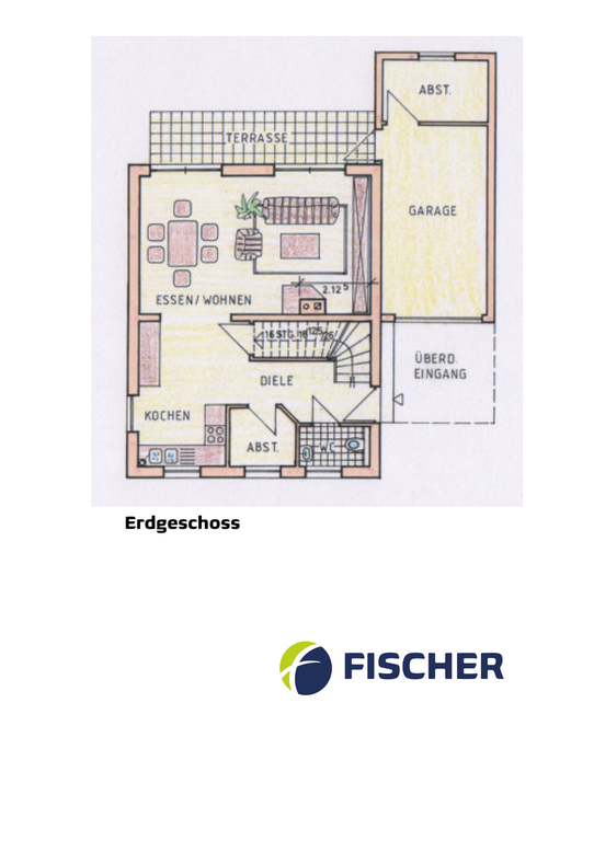 Vom Eingang kommen Sie in den Dielenbereich mit Gäste-WC, einem Abstellraum und dem Aufgang zum Obergeschoss. Es schließt sich ein großzügiger offener Bereich für Kochen, Essen und Wohnen an, mit dem Ausgang zur Terrasse. Im Garten ist ein Rollrasen ausgelegt.